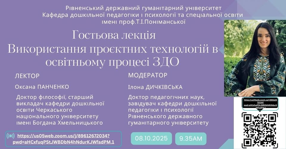 Шановні здобувачі вищої освіти спеціальності А2 Дошкільна освіта 8 жовтня 2025 року запрошуємо вас на гостьову лекцію: "Використання проєктних технологій в освітньому процесі ЗДО"